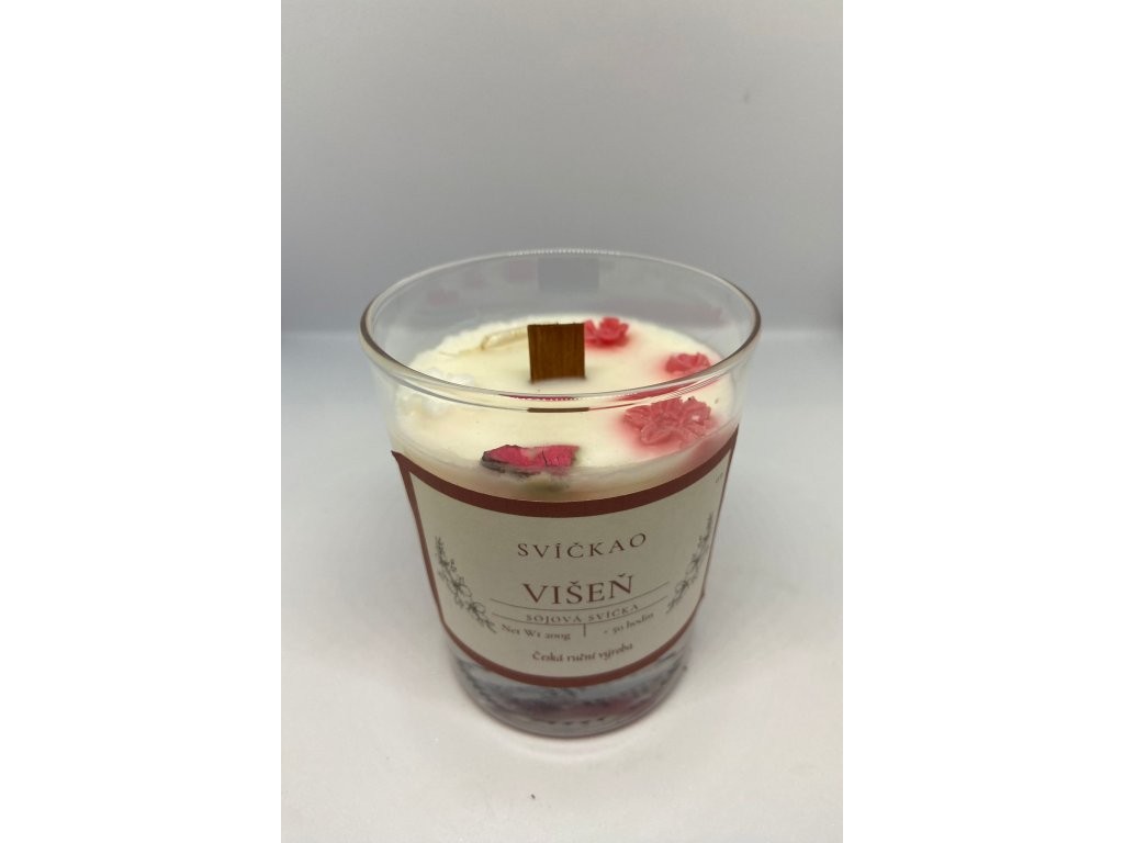 Vychutnejte si sladkou a osvěžující vůni ručně vyráběné svíčky "Višeň", která přináší do vašeho domova příjemnou atmosféru a nádech přírody. Tato luxusní svíčka je vyrobena ze 100% přírodního sojového vosku, což zajišťuje čisté a dlouhotrvající hoření. Dřevěný knot jemně praská, vytváří uklidňující atmosféru a dodává svíčce přirozený šarm.